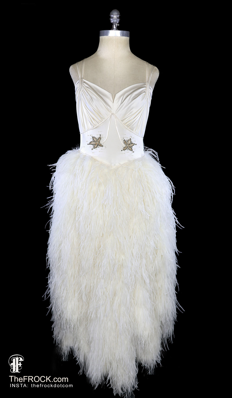 Glorious vintage 1930s Art Deco ivory silk charmeuse bridal (or red carpet) gown with pearl bead & crystal rhinestone jeweled waist, and a magnificent ostrich feather skirt. Multi shoulder straps, side metal zip. Measures bust 35" (with additional room in the bust pleats), waist 28" (the silk has some give so the waist can stretch a couple of additional inches), length is about 54" at longest. Excellent condition.